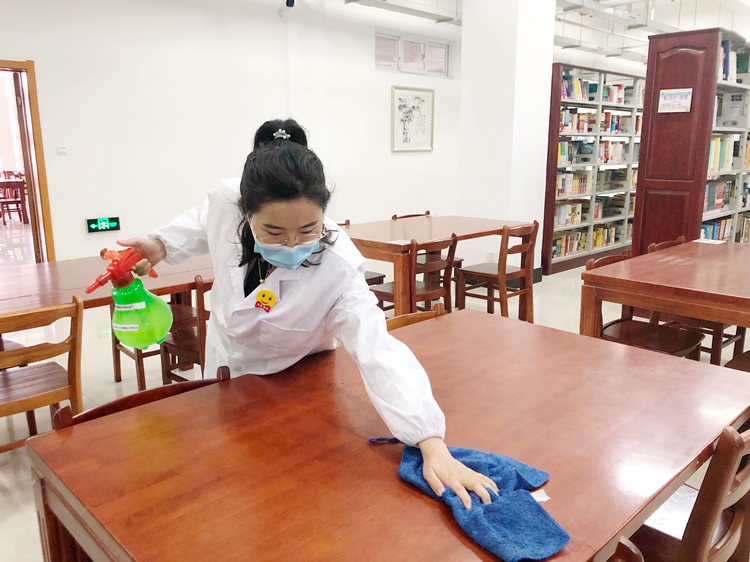 做到加强卫生防疫。加强馆内卫生防疫工作,每日对入馆人员进行体温检测登记,做好日常防护,佩戴口罩,配备足够的洗手液(肥皂)、消毒液及器具。做好日常通风换气,保持室内空气流通,每天定期对电梯、楼梯扶手、卫生间、桌椅、自助借还机等进行清洁消毒,阻断感染源,全方位改善馆内环境卫生条件。将口罩等医疗废弃物放置在专用垃圾箱内,定时有效安全处理。