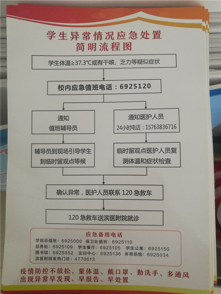 第五,做好应急处置关。为做好师生员工突发异常疫情的处置,制作了校园异常应急处置简明流程图,设置了应急联系电话,张贴在每个教室、宿舍、重点场所,以备出现异常情况早报告、早处置。