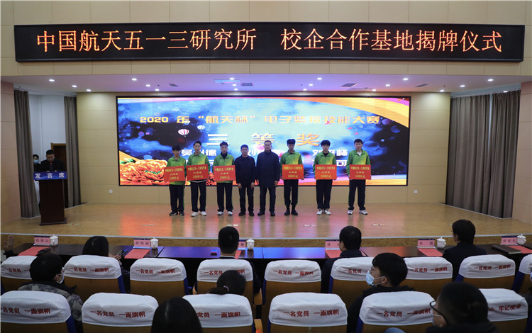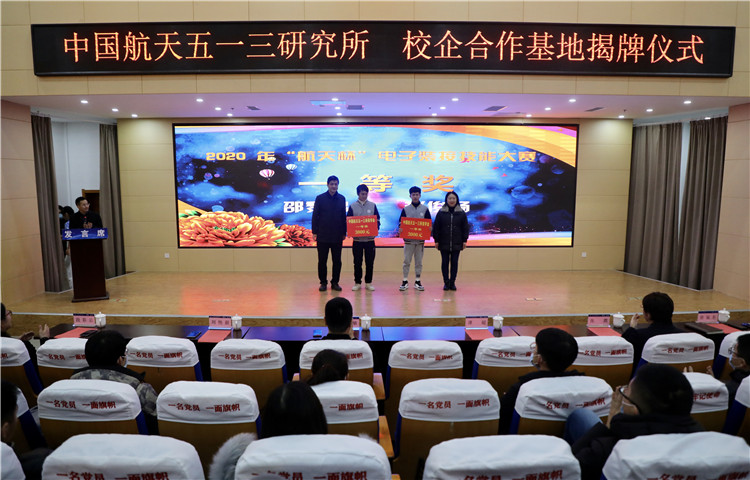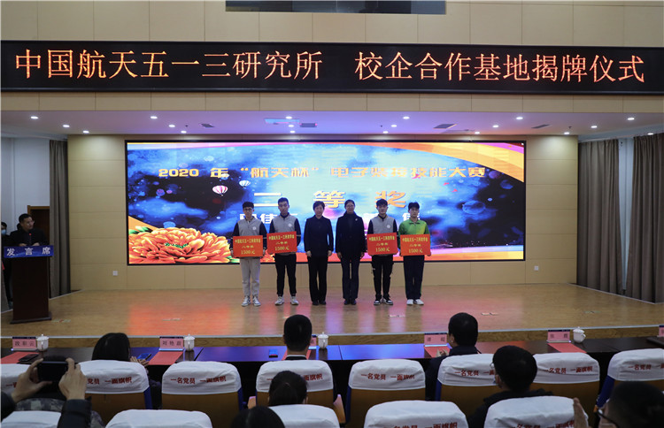 仪式中,校企双方共同签订“校企合作基地”协议,举行揭牌仪式,并完成“中国航天五一三所”奖学金交接。同时在校企双方领导共同见证下,进行2020 年“航天杯”电子装接技能大赛颁奖典礼,为在比赛中成绩优异,实践能力突出的同学点赞、喝彩。
