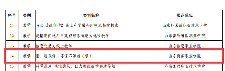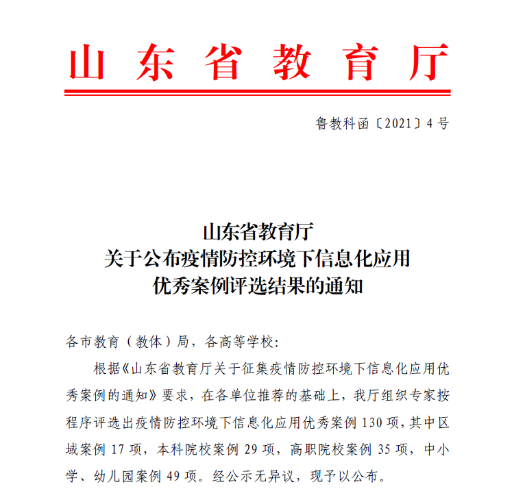 本站讯 近日,《山东省教育厅关于公布疫情防控环境下信息化应用优秀案例评选结果的通知(鲁教科函〔2021〕4 号)》公布了评选结果。经专家评审,全省共评选出35个高职院校优秀案例。我校教务处提报的《量、质双保,停课不停教(学)》、后勤服务处提报的《信息化智慧后勤筑就高校“战疫”防护盾 》两项入选。