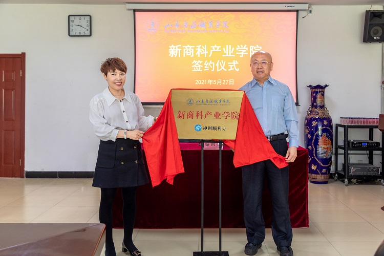 陶传蔚代表学校致辞,对马凤君总经理一行表示热烈欢迎,对“新商科产业学院”的设立表示衷心祝贺,对双方共建“新商科产业学院”给予了高度肯定,向企业介绍了学校的发展历程及近年来的成就,并在分析国家职教政策的基础上,和大家一起展望新时代职业教育的发展前景和校企深度融合的光明前途。他希望,在未来进一步深度合作的进程中,双方发挥资源优势协同育人,实现共赢发展,能为国家经济转型升级培养出更为优秀人才。神州顺利办教育事业部总经理曹世明向大家介绍了公司的基本情况,并就下一步如何开展深度合作和大家做深入交流。按照会议议程,陶传蔚、马凤君分别代表学校和山东神州顺利办企业管理有限公司签订了新商科产业学院合作协议,并为新商科产业学院揭牌。
