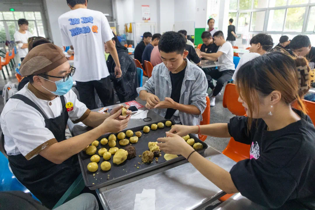 9月21日上午,在基础教学部、智能制造学院共同组织开展的“颂百年华诞 庆别样中秋”制作月饼活动中,学院邀请专业的烘焙志愿者担任老师,演示月饼的制作方法,从称量面团到擀皮,从包馅到压模,不到十分钟皮薄馅靓的月饼就做好了。特殊磨具压出的“中国”字样,格外显眼。当看到一个个漂亮的月饼从自己手中诞生,看着自己的劳动成果,大家脸上都露出了欢快的笑容。