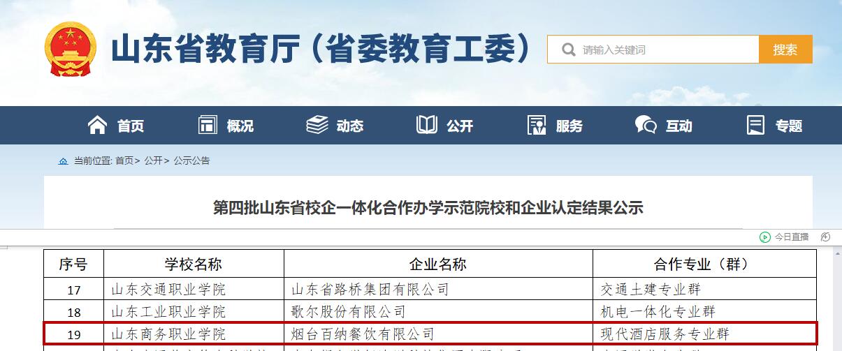 本站讯 近日,山东省教育厅公布了第四批山东省校企一体化合作办学示范院校和企业名单,我校获批成为山东省校企一体化合作办学示范院校,现代酒店服务专业群—烟台百纳餐饮有限公司被确定为校企一体化合作办学示范企业。本次评选全省共有35个中高职院校和合作企业入选。