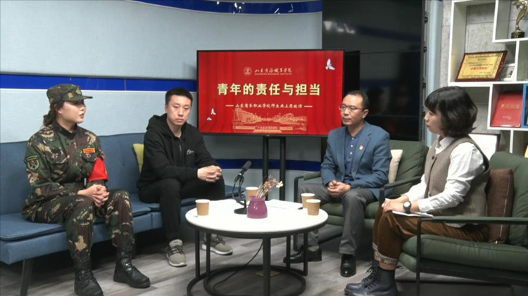 本次战“疫”云端思政课以“青年的责任与担当”为主题,由思政部史梦瑶老师担任主持人,通过对话聊天的方式,从志愿者梁会雪的讲述中了解到学校强军思想先锋连等学生社团在学校战“疫”中的志愿服务以及其中的感人瞬间;从负责学生工作的驻校教师闻文的描述中知道了学校封闭管理期间老师们工作的不易和对家人的愧疚;思政部主任姜强从当前青年人面对的质疑声和应当承担的责任两个问题入手,以共青团成立百年为契机,因势利导,探讨了在战“疫”期间商务学子的实际行动,用行动诠释了90后、00后的爱国情怀,用行动证明了90后、00后的责任与担当。