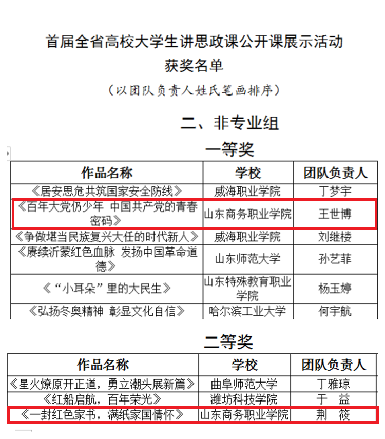 本站讯 近日,山东省教育厅公布了首届全省高校大学生讲思政课公开课展示活动获奖名单,我校参赛作品《百年大党仍少年 中国共产党的青春密码》荣获非专业组一等奖,《一封红色家书,满纸家国情怀》荣获非专业组二等奖。通过参加此次活动,展现了我校学子对思政课教学的认识与思考,充分彰显了我校学子的思想政治素养和勇毅前行的精神风貌。