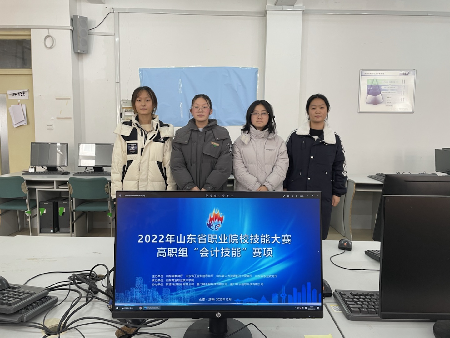 本站讯 12月17日至18日,山东省职业院校技能大赛(高职组)“会计技能”赛项线上举行,我校会计金融学院21级大数据与财务管理专业王永彤、杨燚鑫、宫冰璐、李佩芳4名同学组成的参赛队伍,在王伟、李洁两位老师的指导下,取得省赛一等奖第一名的好成绩。
