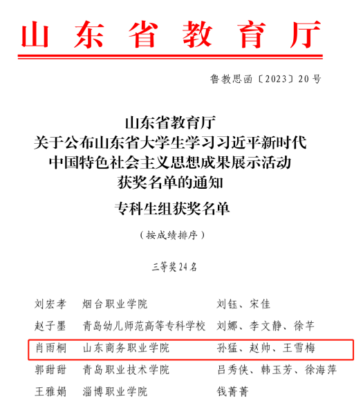 本站讯 近日,在山东省教育厅主办的大学生学习习近平新时代中国特色社会主义思想成果展示活动中,我校参赛作品《中国人要把饭碗端在自己手里》荣获专科组三等奖。