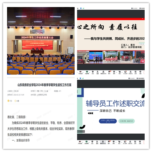 工作抓早 部署有高度。为确保新学期学生工作的顺利开展,学校先后多次召开新学期学生工作会议,部署工作安排,有序开展各项准备。召开二级学院分管学生工作副书记、副院长学生工作研讨会,就2024年学生工作要点开展了研讨交流;召开学生工作经验分享会,共享学生管理先进经验,为新学期开展工作赋能增效;召开学生工作动员部署大会,对新学期学生工作提出确保加强思想引领不动摇,严守安全底线不松懈,做好服务育人不止步等工作要求。通过系列会议的召开,助力学工人员明确目标、统一思想、提振精神、凝心聚力。