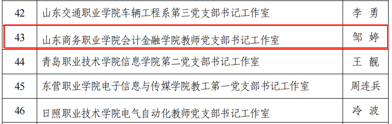 本站讯 近日,山东省委教育工委公布了第三批全省高校“双带头人”教师党支部书记工作室建设单位名单,我校会计金融学院教师党支部书记工作室榜上有名。这是我校首次入选全省高校“双带头人”教师党支部书记工作室建设单位。