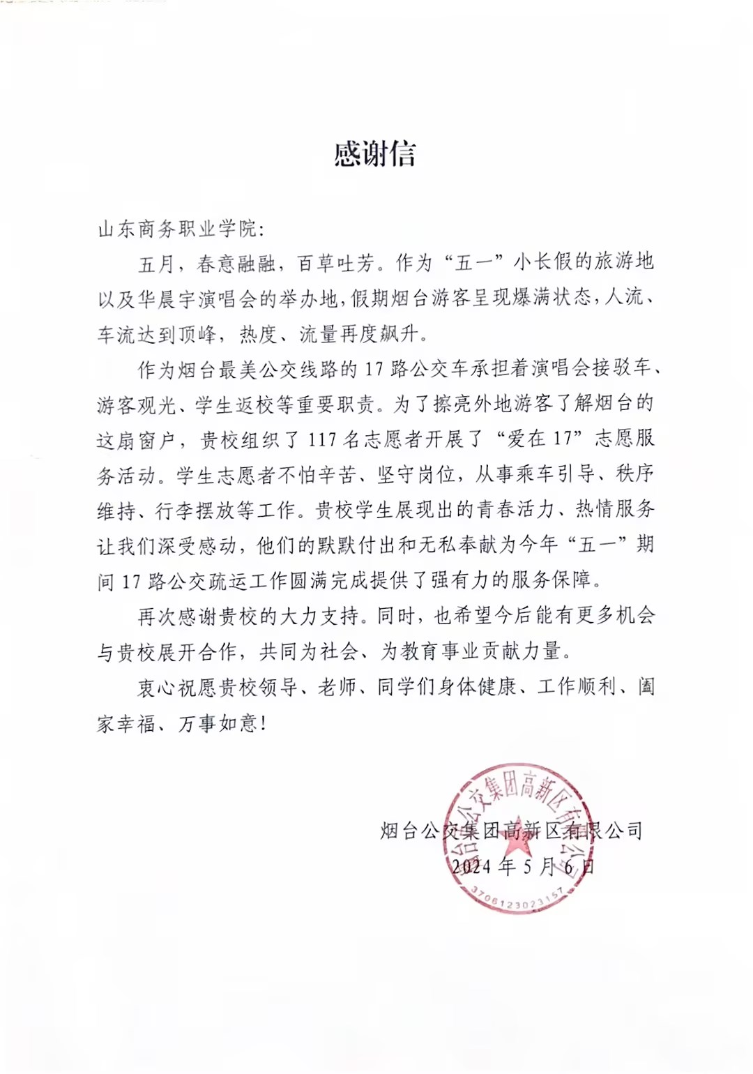 烟台市公交集团高新区有限公司以一面锦旗感谢学校对公交疏运志愿服务工作的关注和贡献,肯定了学校师生正气充盈、昂扬向上的精神风貌,感谢信更是字字真情、句句肺腑,给予学校、学生高度评价。本次公交疏运工作时间紧、任务重,能够顺利完成离不开学校的大力支持和学生的辛勤付出,希望进一步加大与我校的交流合作,共同为社会提供更优质服务,培养更多有责任心、有能力的年轻人。