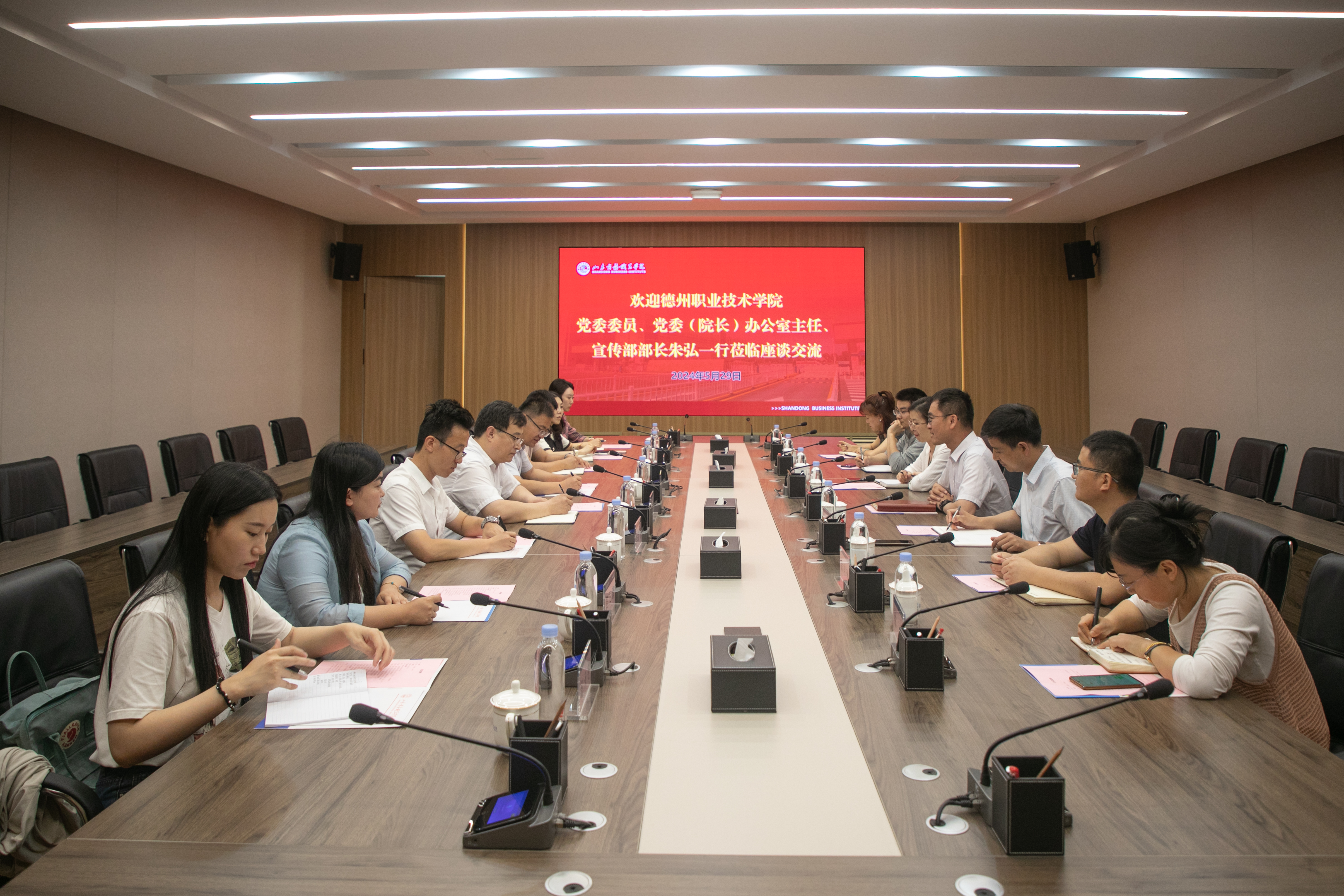 本站讯 5月29日上午,德州职业技术学院党委委员、办公室主任、宣传部部长朱弘一行来校交流座谈。我校党委委员、宣传统战部部长孙芹宝,党委(学校)办公室主任王新光出席座谈会。会议在办公楼一楼会议室举行。