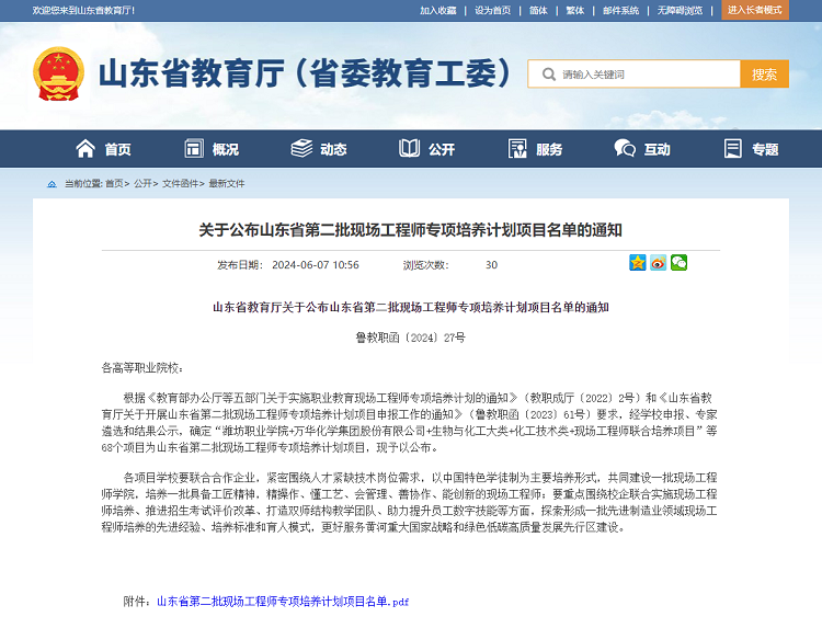 本站讯 近日,山东省教育厅公布了山东省第二批现场工程师专项培养计划项目名单,我校由信息工程学院牵头申报的“山东商务职业学院+浪潮集团有限公司+电子与信息大类+计算机类+现场工程师联合培养项目”成功入选。