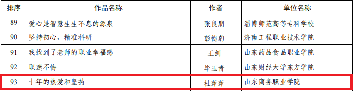 本站讯 近日,山东省教育厅公布“师者本色—我的从教故事”活动优秀征文名单,我校教师杜萍萍的文章《十年的热爱和坚持》被评为优秀征文。