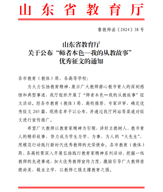 “师者本色—我的从教故事”征文活动由山东省教育厅举办,是为大力弘扬教育精神,展示广大教师潜心教书育人的深刻感悟和典型事迹。激励引导广大教师崇德尚美、敬业立学,以教师之强支撑教育之强。