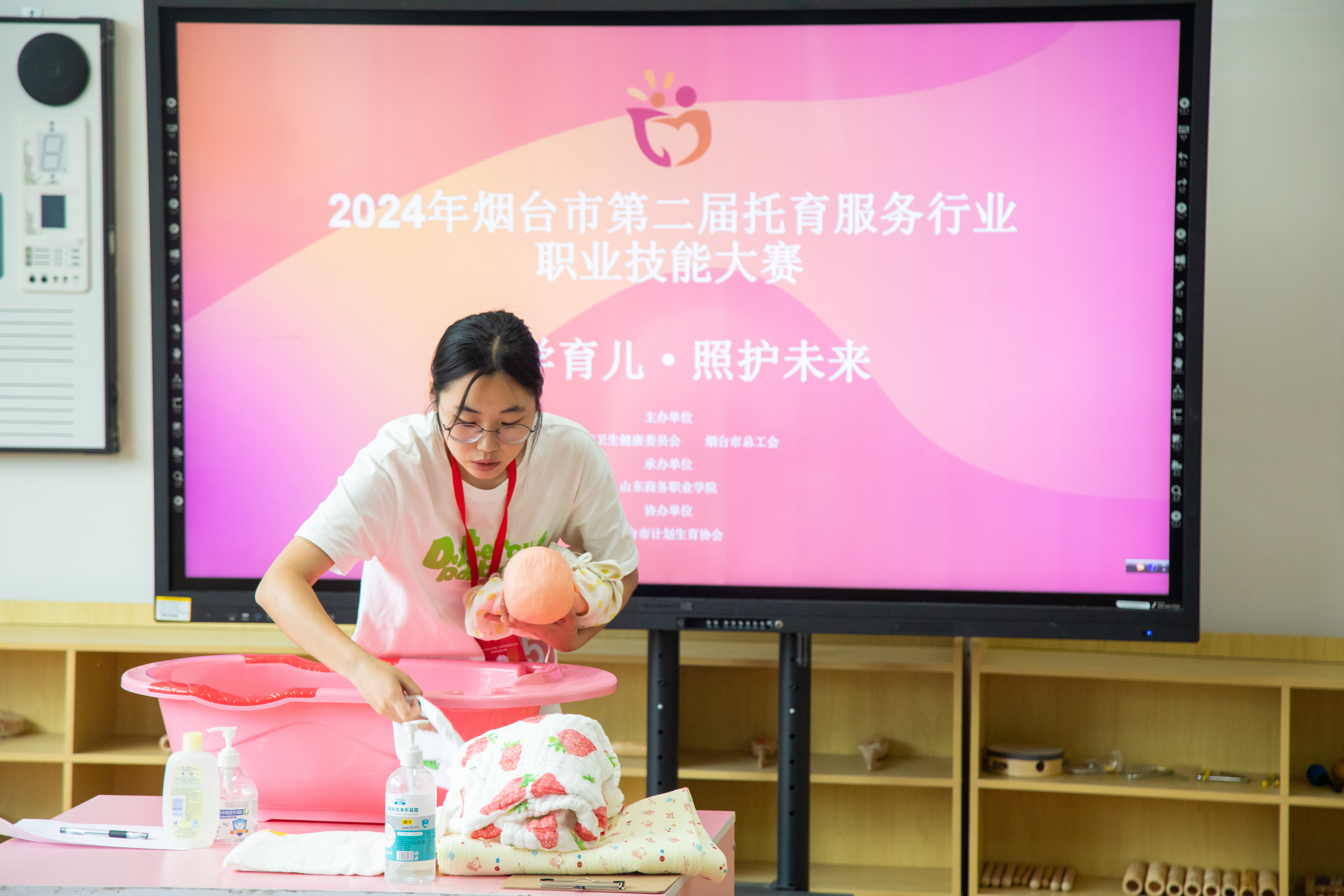 本站讯 7月16日,烟台市第二届托育服务行业职业技能大赛在我校成功举办。本次大赛由烟台市卫生健康委员会、烟台市总工会主办,我校承办,烟台市计划生育协会协办,旨在贯彻落实国务院办公厅《关于促进3岁以下婴幼儿照护服务发展的指导意见》,进一步提升烟台市婴幼儿照护服务行业的质量与水平,强化托育行业人才队伍建设和发展。