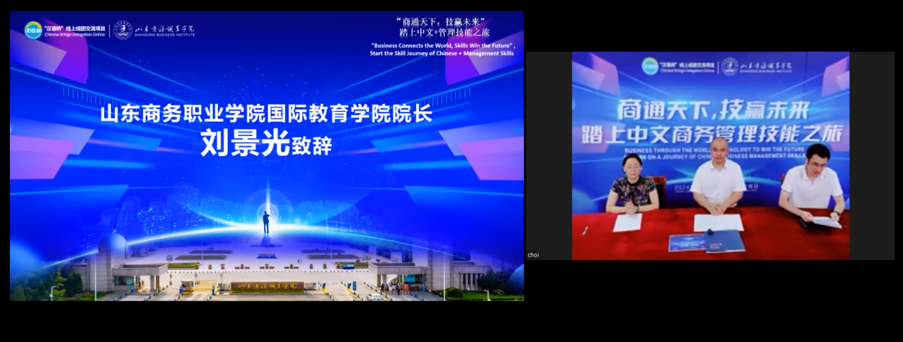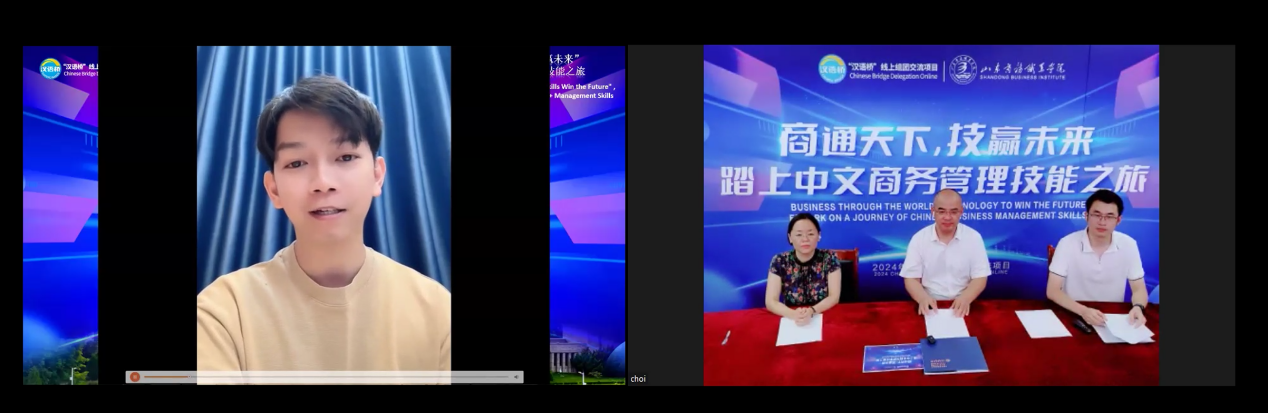 教师代表侯伟玲为学员们送上寄语,希望学员们能够借此宝贵契机,积极投身与中国的友好事业,成为增进两国友谊的使者和促进合作的桥梁。期待学员们日后有机会来到中国、烟台和山东商务职业学院,继续深入学习交流。班主任王翔在仪式上向大家介绍了本次项目实施与完成情况并进行了汇报。本次平台注册学员共计116名,第一批完成平台课程任务并获得结业证书的学员共72名,其中10名学员被评选为“优秀学员”。同时,平台调查问卷共收到反馈意见102条,好评率达到99.6%,其中对于教师教学能力、课程种类等好评率均达到100%。