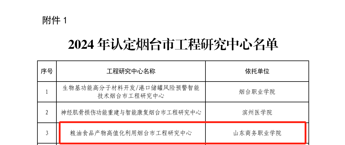 本站讯 近日,烟台市发展和改革委员会发布了2024年新认定烟台市工程研究中心名单,我校联合烟台双塔食品股份有限公司共建的“粮油食品产物高值化利用烟台市工程研究中心”(以下称“研究中心”)获批烟台市工程研究中心立项建设,这是我校继2022年获批“健康粮油创新技术应用烟台市工程研究中心”之后的又一市级重要科研平台。