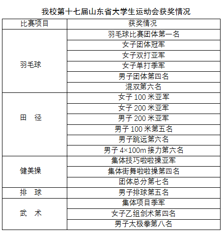 本站讯 11月12日,随着最后一个赛项—“羽毛球比赛”项目的结束,山东省第十七届大学生运动会落下帷幕。经过为期两个多月、两百多场次的角逐鏖战,我校代表团夺得了1金5银2铜的骄人成绩,展现了我校运动健儿良好的精神面貌,实现了运动成绩和精神文明“双丰收”。