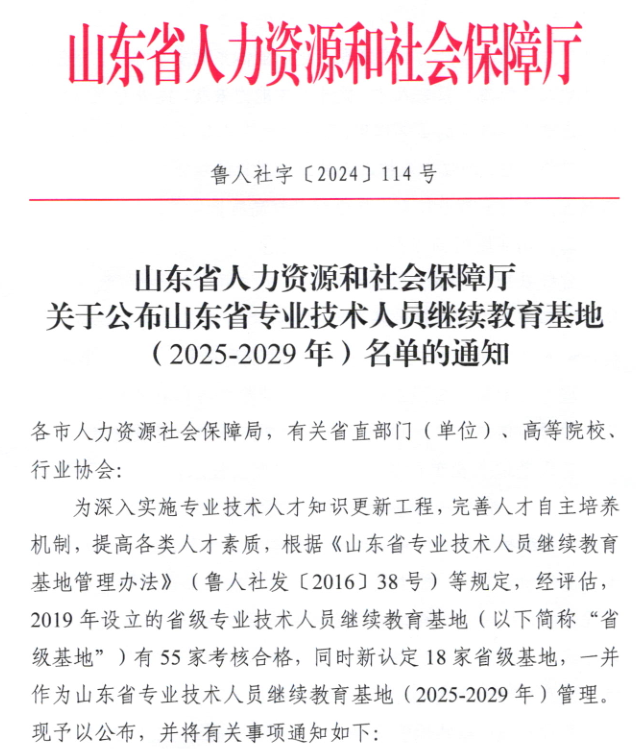 本站讯 近日,山东省人力资源和社会保障厅公布山东省专业技术人员继续教育基地(2025—2029年)名单,我校通过考核评估并成功入围。