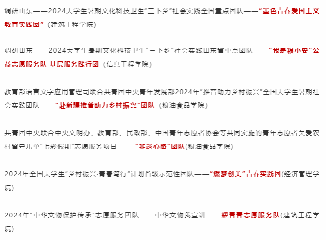 2024年暑期,学校580余支团队,6200多名商务学子,以青春之名,赴家乡之约,积极响应学校党委和各级团组织的号召,深入开展社会实践,在科技创新、乡村振兴、绿色发展、社会服务、民族团结等各领域各方面工作中发挥了积极作用。全校获评“调研山东”—全国重点团队1个,国家级专项重点团队3个,省级重点团队2个,大家结合所学专业,发挥自身专长,在基层一线、在社会大课堂中磨炼了意志、砥砺了品格、增长了才干,共收获调研报告80余篇,思想感悟2000余份,特色服务项目45个,推送新闻30余篇,活动在学习强国、中国教育在线、网易、搜狐等多个媒体报道。