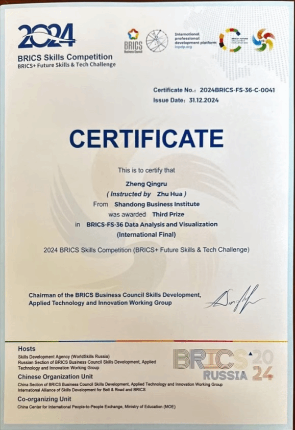 本站讯 近日,我校信息工程学院参赛选手郑庆儒凭借扎实的专业技能和出色的发挥,荣获 2024 金砖国家职业技能大赛数据分析与可视化赛项国际总决赛三等奖。