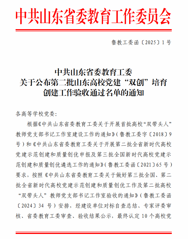 本站讯 近日,山东省委教育工委公布了第二批全省高校党建“双创”(党建工作示范高校、标杆院系、样板支部)培育创建单位验收结果,我校会计金融学院党总支以优异成绩通过验收,标志着学院党建工作再上新台阶。
