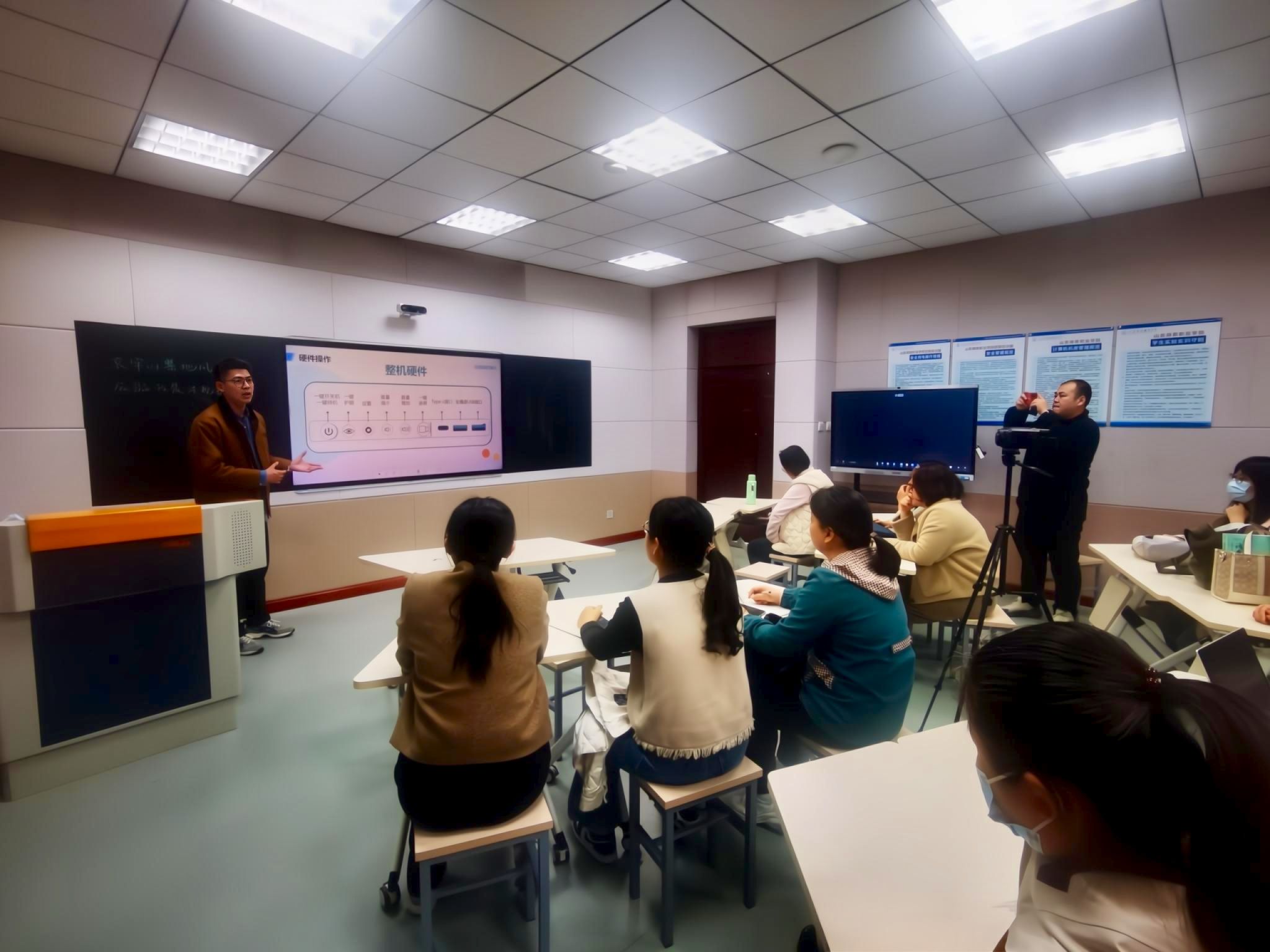 沉浸式培训赋能,解锁智慧教学新模式。培训中,希沃讲师姜敬瀚围绕“录播系统操作”“多屏协作技巧”“AI课程设计”三大模块展开教学。教师们通过现场操作智慧黑板进行课程录制模拟,体验“一键式”多机位切换、小组讨论屏投屏共享等功能。针对教学能力大赛中常见的课堂实录需求,姜敬瀚重点演示了智能跟踪摄像机的师生互动捕捉、板书特写自动切换等应用场景,帮助教师掌握高效产出优质教学视频的核心技能。