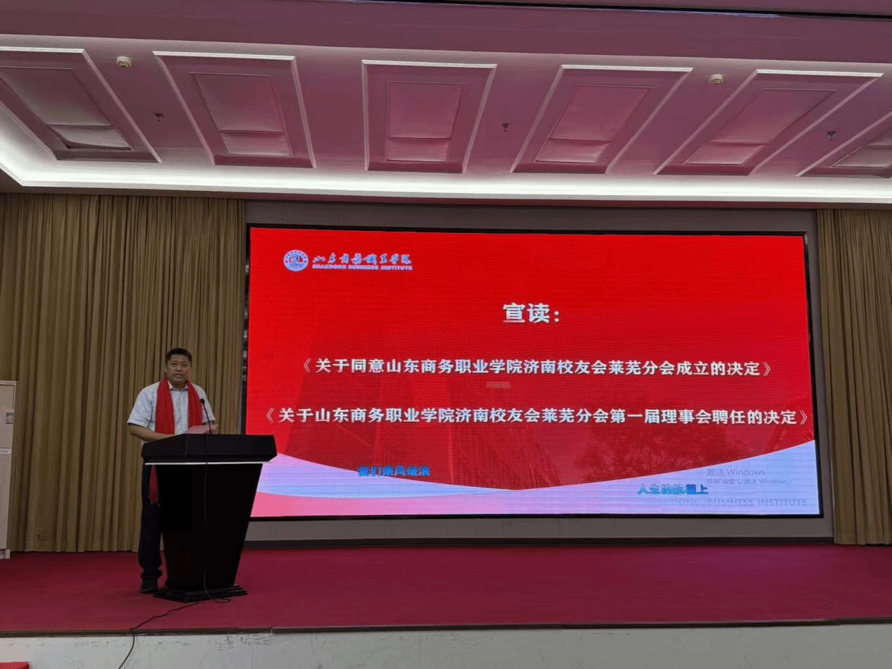 宫国学宣读了《关于同意山东商务职业学院济南校友会莱芜分会成立的决定》以及《关于山东商务职业学院济南校友会莱芜分会第一届理事会聘任的决定》。