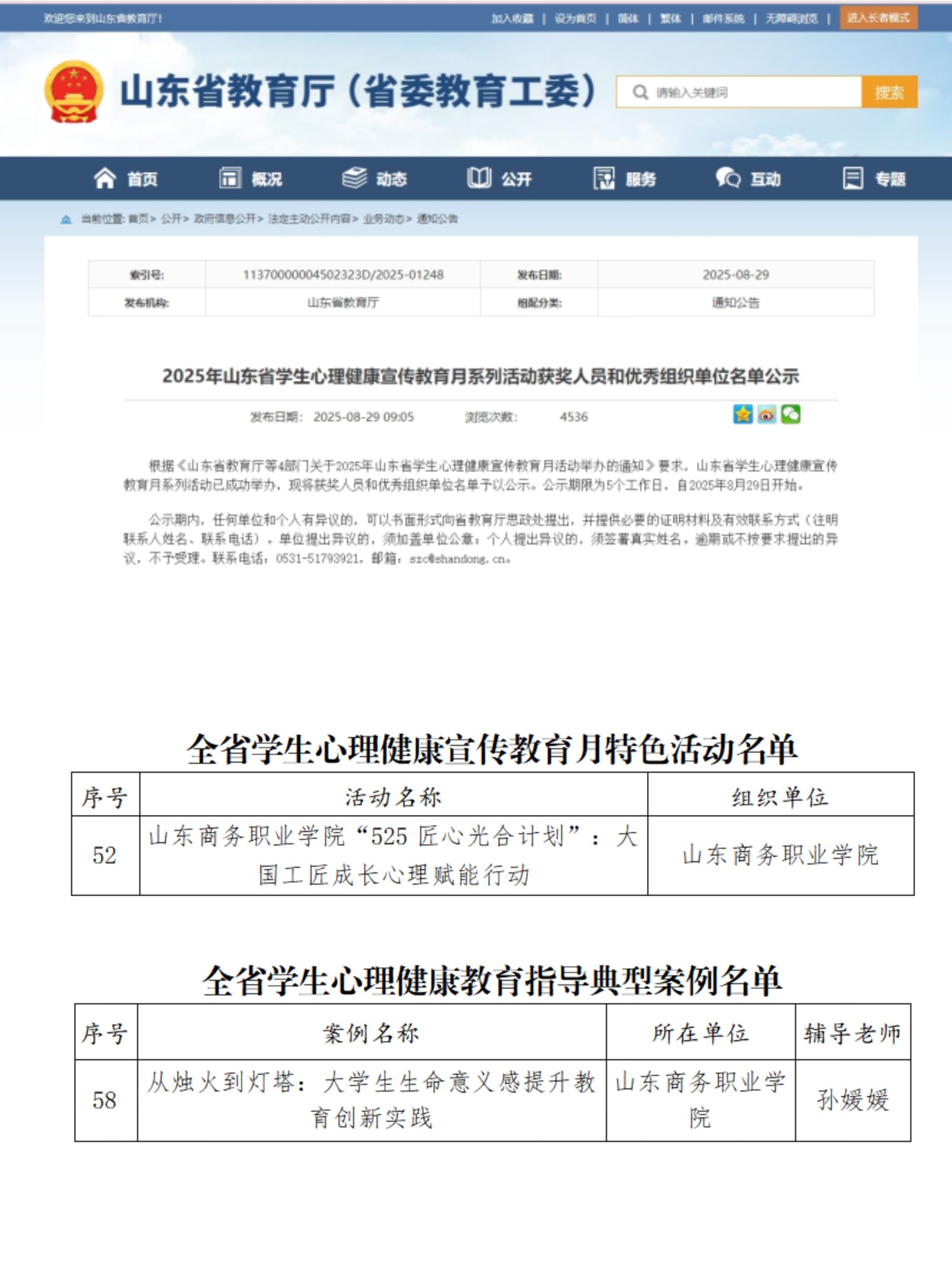 本站讯 近日,山东省教育厅公布2025年山东省学生心理健康教育月展示活动获奖名单,我校报送的“心理健康宣传教育月特色活动”和“心理健康教育指导典型案例”作品均入选获奖。
