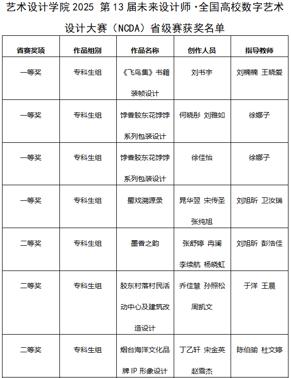 此次在NCDA大赛中取得的佳绩是艺术设计学院育人实力的集中展现,更是学院迈向高质量发展的有力起点。未来,学院将继续以师资建设为核心、以教学改革为动力、以实践创新为路径,着力培养兼具家国情怀、国际视野与过硬本领的新时代设计人才,在服务国家战略与地方产业发展中彰显更大作为。(通讯员:姜俊岐 撰稿:李艳彩 审核:王晨 于洋 梁倩 值班审核:周书囡)