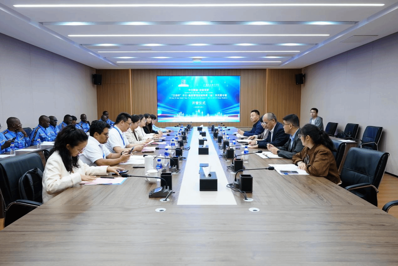 本站讯 10月11日,由教育部中外语言交流合作中心主办,我校承办的2025年“汉语桥”夏令营开营仪式在办公楼一楼会议室举行。来自几内亚、秘鲁15位海外企业属地班组长和领队及翻译人员将在中国展开为期两周的文化学习和交流活动。本次“汉语桥”夏令营以“中文赋能·技能筑梦——中文+基层管理技能”为主题,旨在提升海外企业属地班组长中文水平与职业管理能力,促进中外文化交流与职业发展融合。有色金属工业人才中心教育培训处副处长刘九青,学校党委委员、副校长于邢香出席开营仪式并致辞。开营仪式由国际教育学院院长刘景光主持。