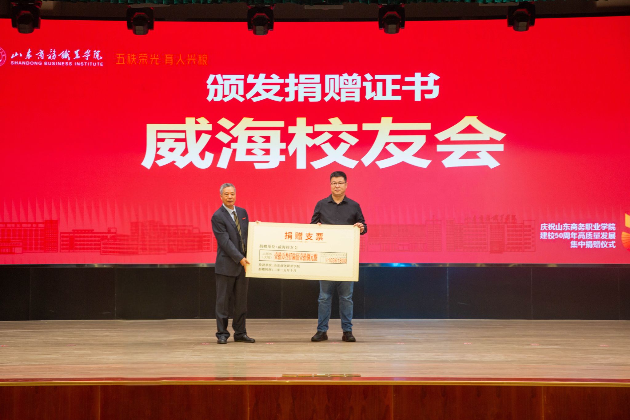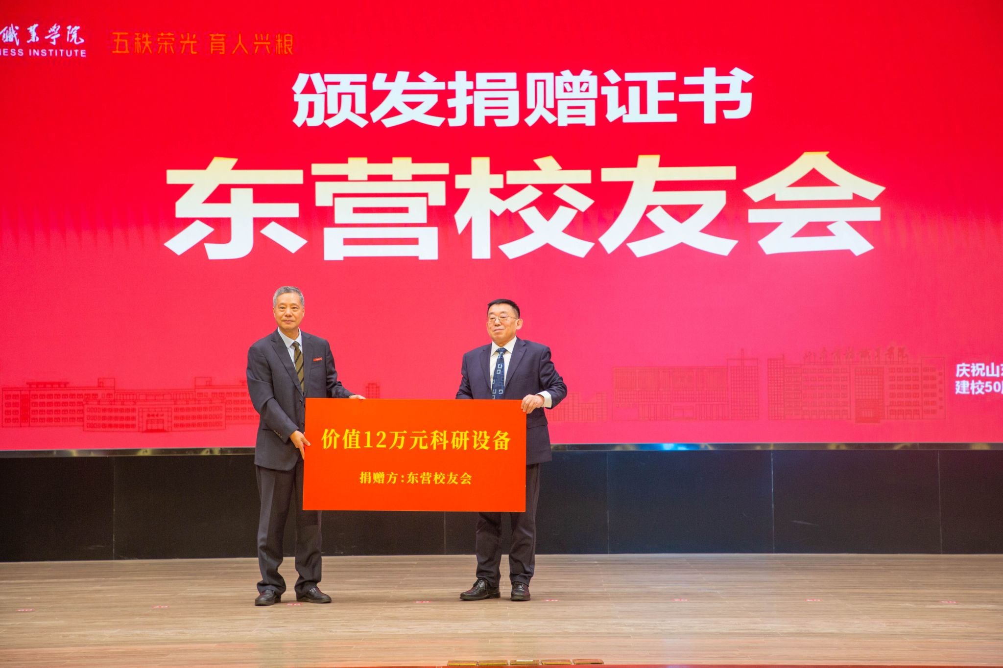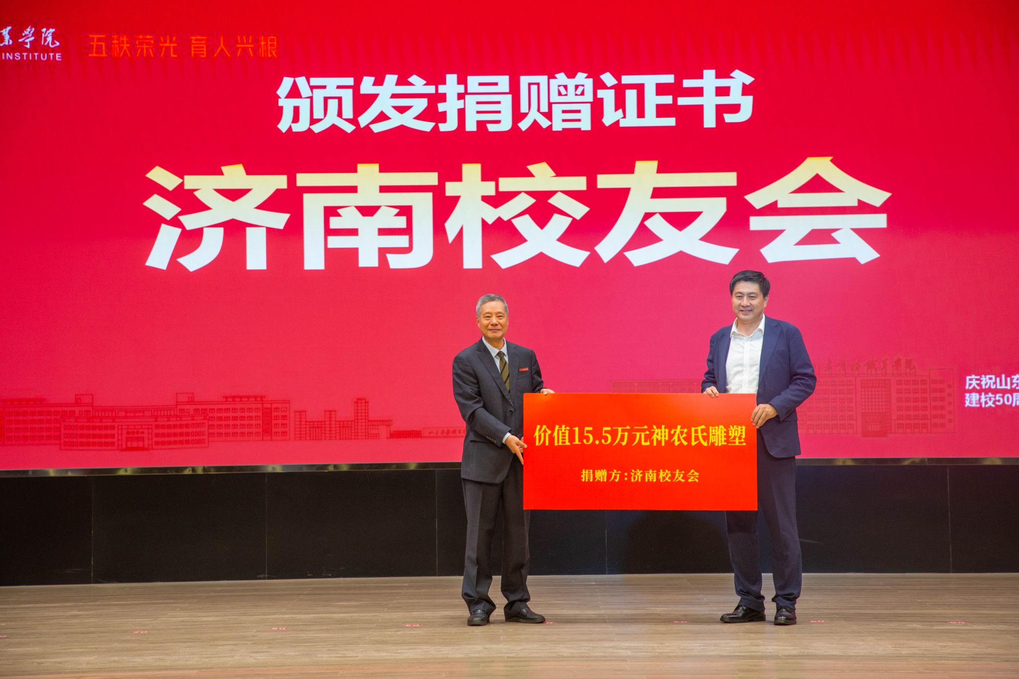仪式上,滨州中裕食品有限公司、浪潮集团有限公司、北京大圣光华教育科技集团、山东龙仕物业管理有限公司、青岛维良食品有限公司、济南弘博教育培训学校等6家企业,17个地方校友会以及多名校友,向学校捐赠了雕塑、科研实训设备、现金等物资。学校逐一向捐赠方颁发捐赠证书。