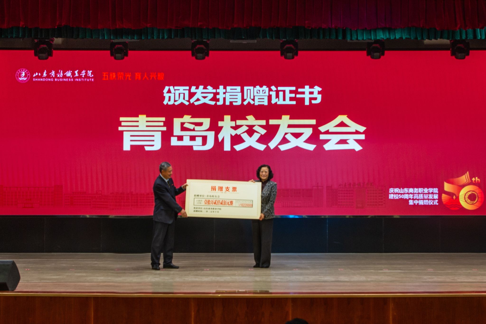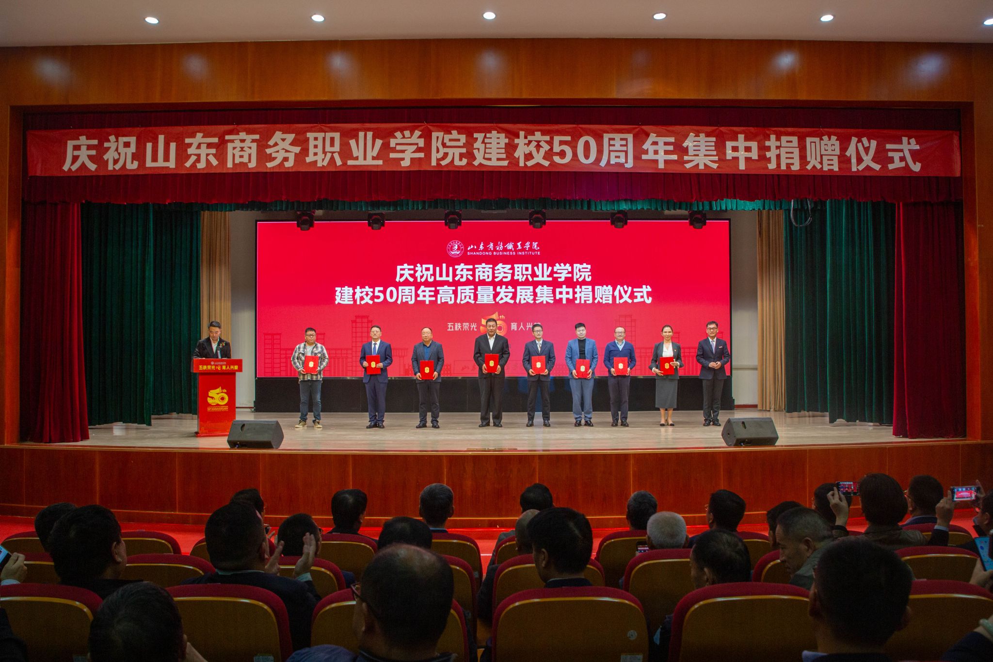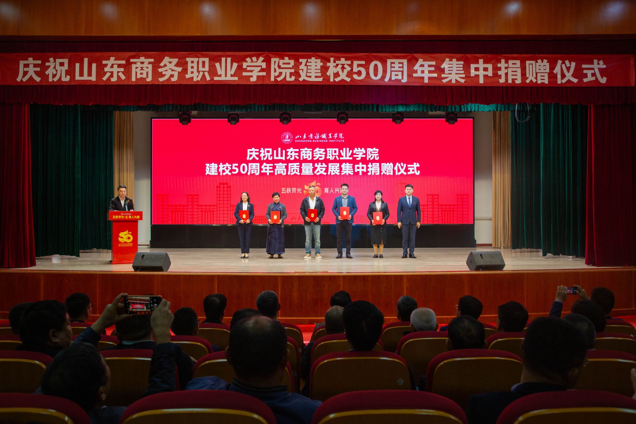 仪式上,滨州中裕食品有限公司、浪潮集团有限公司、北京大圣光华教育科技集团、山东龙仕物业管理有限公司、青岛维良食品有限公司、济南弘博教育培训学校等6家企业,17个地方校友会以及多名校友,向学校捐赠了雕塑、科研实训设备、现金等物资。学校逐一向捐赠方颁发捐赠证书。