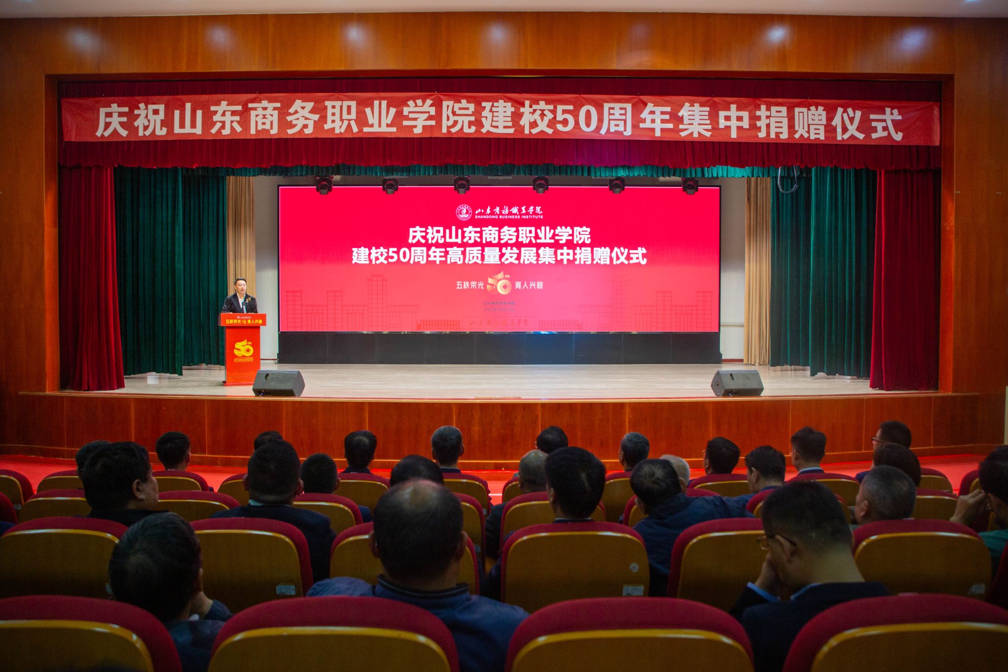 本站讯 10月17日下午,我校庆祝建校50周年捐赠仪式在音乐厅隆重举行。山东省粮食和物资储备局党组成员、副局长吕明出席捐赠仪式。学校党委书记孙云茂,党委副书记、校长王发明等领导班子成员参加仪式。