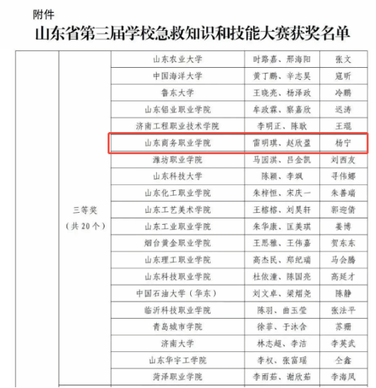 本站讯 近日,山东省第三届学校急救知识和技能大赛在临沂职业学院落下帷幕。本届大赛吸引了来自全省包括本科院校、高职专科院校在内的近百所高校的400余名师生同台竞技。我校代表队首次参赛便凭借出色表现,最终荣获高校甲组(非专业组)团体三等奖,充分彰显了学校师生扎实的应急救护能力和昂扬的精神风貌。