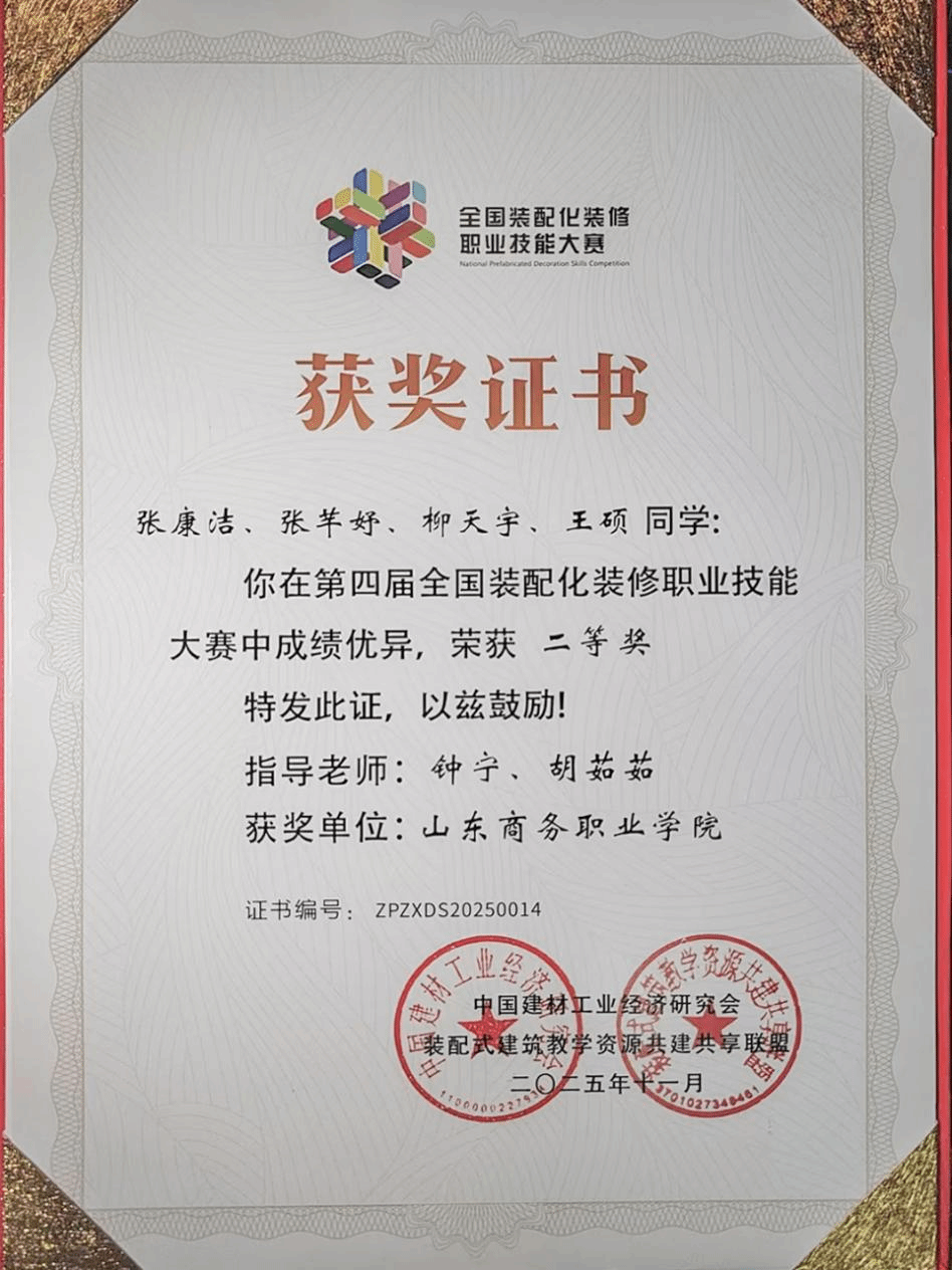 本站讯 11月1日,第四届全国装配化装修职业技能竞赛全国总决赛在浙江工业职业技术学院(浙江绍兴)落幕。我校建筑工程学院钟宁、胡茹茹老师指导的建筑装饰工程技术专业参赛队,从全国百余支优秀队伍中突围,最终荣获全国二等奖。此次获奖不仅是对参赛师生专业能力的高度认可,更充分彰显我校在建筑装饰前沿领域的人才培养硬实力,为学校职业技能竞赛成果再添重要一笔。