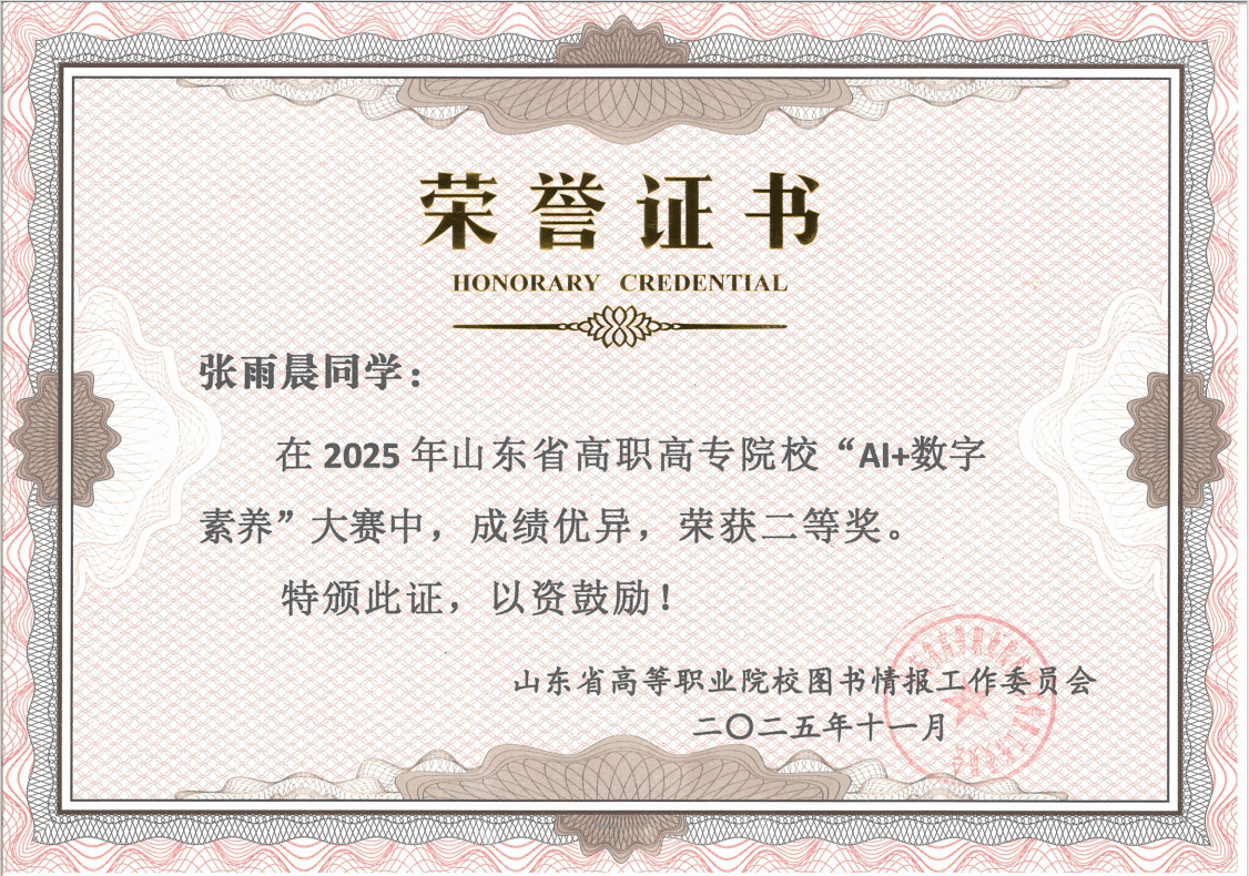 本站讯 近日,2025年山东省高职院校“AI+数字素养”大赛圆满落幕。本次大赛由山东省高等职业院校图书情报工作委员会主办,共有来自全省48所高职院校的226名学生参赛,我校参赛学子凭借扎实的专业功底与出色的实践能力,在全省竞争中脱颖而出,荣获省级二等奖。