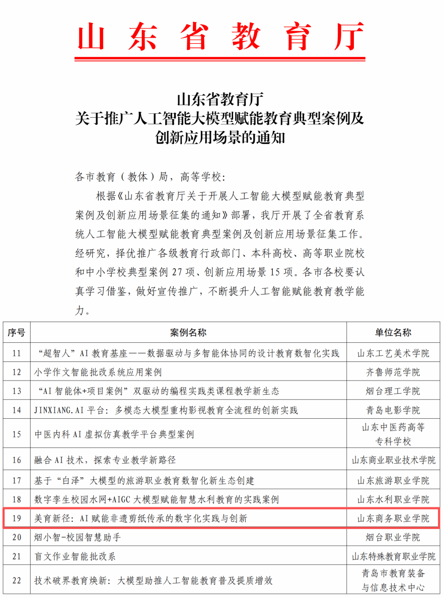 本站讯 1月5日,山东省教育厅公布了《关于推广人工智能大模型赋能教育典型案例及创新应用场景的通知》,我校信息工程学院“美育新径:AI赋能非遗剪纸传承的数字化实践与创新”项目成功入选,成为传统文化传承与现代教育深度融合的标杆案例。此次典型案例来自教育行政部门、本科高校、高等职业院校和中小学,共有27项入选,高职专科院校仅6所。