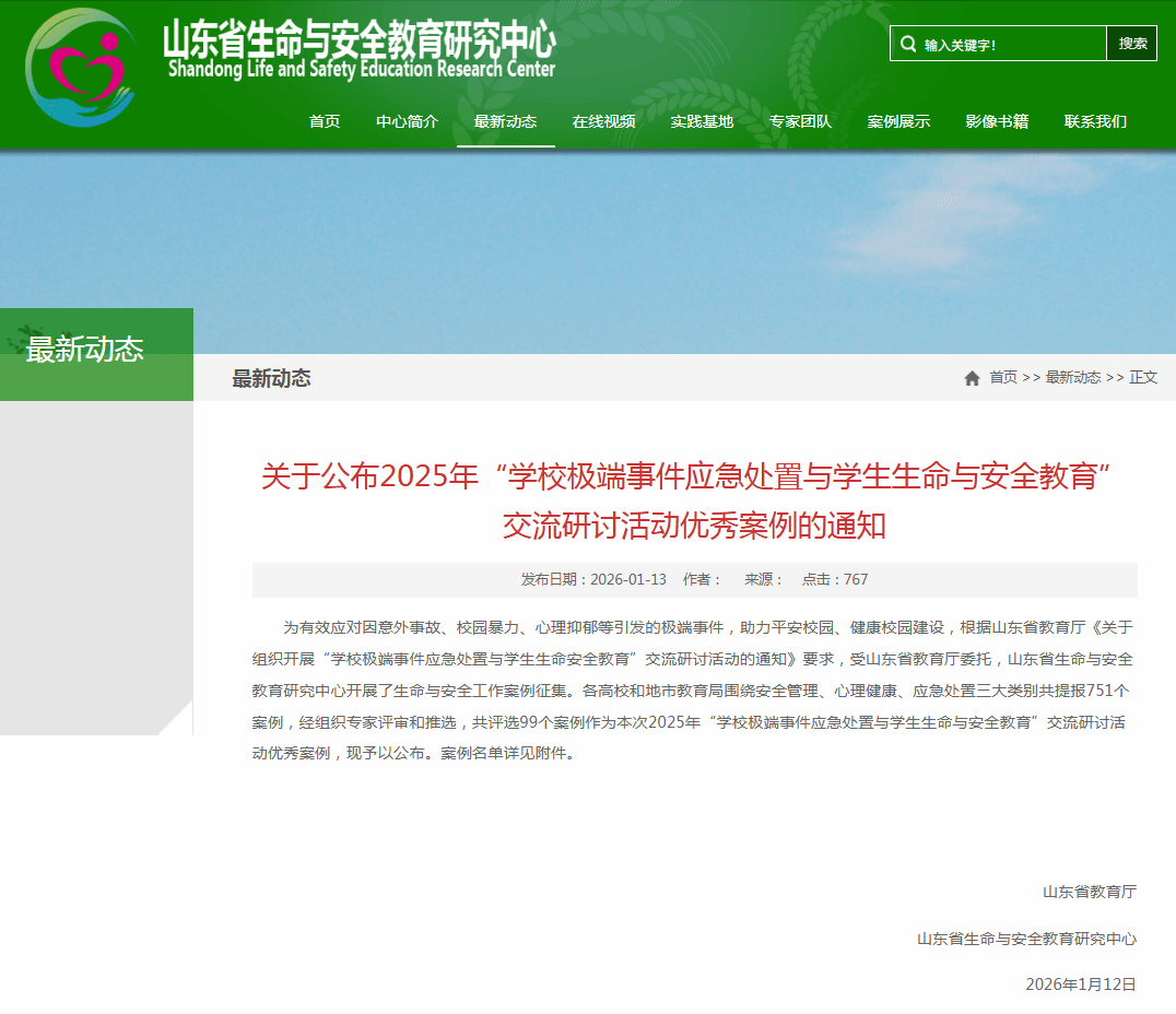 本站讯 近日,山东省教育厅与山东省生命与安全教育研究中心联合公布了2025年“学校极端事件应急处置与学生生命与安全教育”交流研讨活动优秀案例评选结果。经专家评审,全省共评选出99项优秀案例,我校教师提交的案例成功入选,展现了我校在校园安全管理、心理健康教育及应急处置工作中的扎实成效与创新实践。