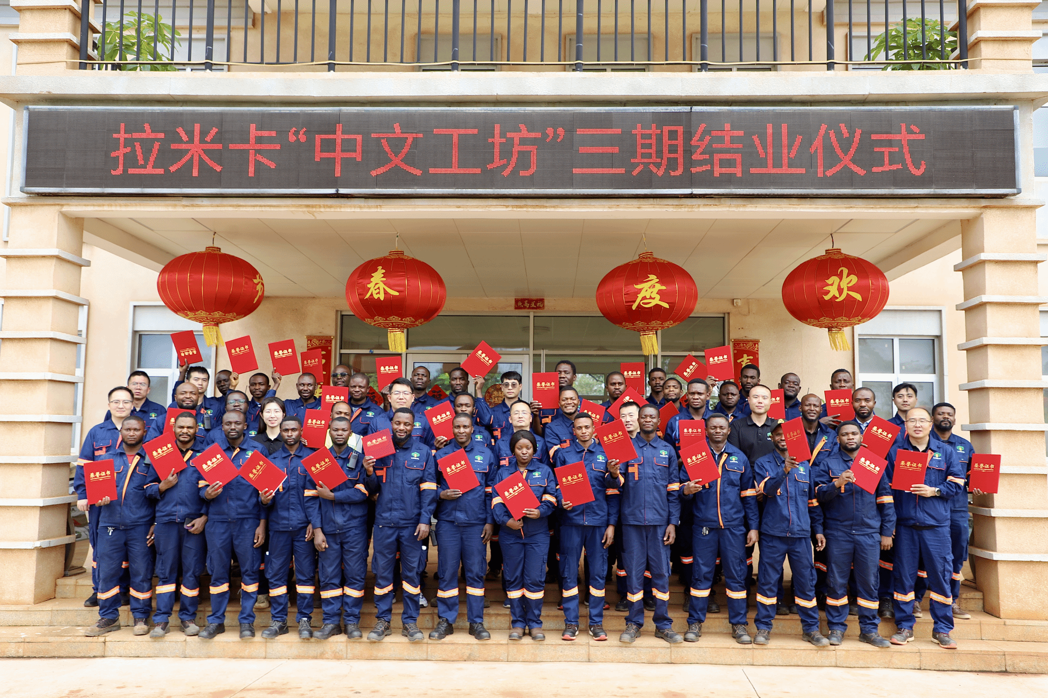本站讯 当地时间2月20日,由我校与刚果(金)拉米卡股份有限公司合作共建的刚果(金)班·墨学院(北方矿业)暨拉米卡中文工坊三期结业仪式在项目驻地举行。此次仪式标志着我校“中文+职业技能”国际合作项目在刚果(金)属地化人才培养方面取得阶段性成果。
