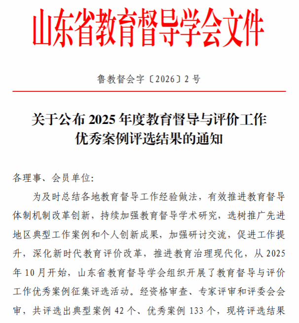 本站讯 近日,山东省教育督导学会公布了2025年度教育督导与评价工作优秀案例评选结果,我校组织申报的两项案例成功入选优秀案例。这标志着我校在“五融五育”教育评价改革创新实践获得权威认可。