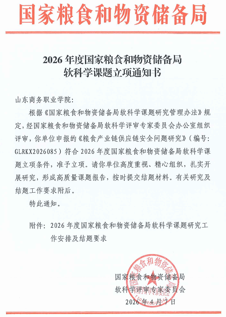 一直以来,学校始终坚持粮食行业办学特色,主动对接国家粮食安全战略与山东省粮食产业集群发展需求,持续强化高水平科研平台、科研团队及高层次课题建设,不断提升服务国家战略、赋能区域发展的能力水平。此次国家级行业课题的成功立项,进一步夯实了学校服务粮食安全领域的社会影响力,为粮食行业技术技能人才培养、粮食产业高质量发展注入了强劲动能。