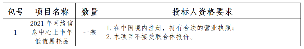 采购内容:2021年网络信息中心上半年低值易耗品;本项目划分一个包;