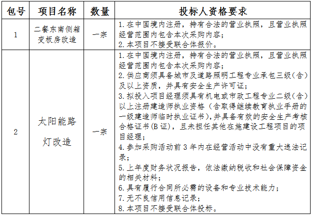 采购内容:二餐东南侧箱变板房改造、太阳能路灯改造;本项目划分两个包;