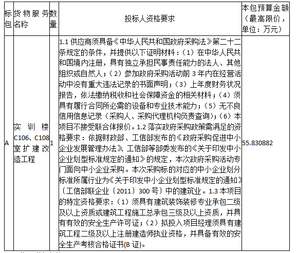 二、采购项目名称:实训楼C106、C108室扩建改造工程