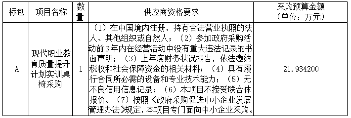 二、采购项目名称:现代职业教育质量提升计划实训桌椅采购