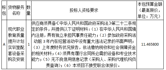 二、采购项目名称:现代职业教育质量提升计划实训室配套设备采购及安装