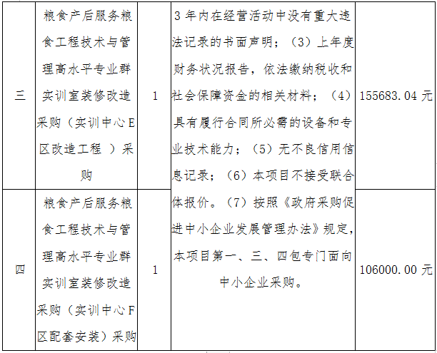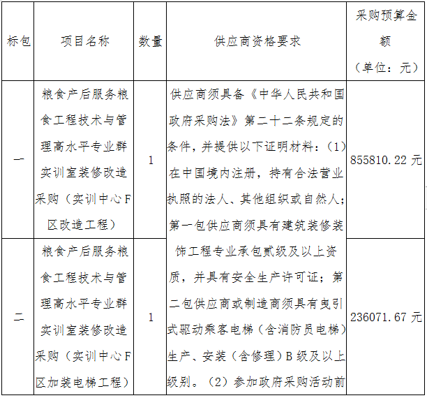 二、采购项目名称:粮食产后服务/粮食工程技术与管理高水平专业群实训室装修改造采购(实训中心F区改造工程)、实训室装修改造采购(实训中心F区加装电梯工程)、实训室装修改造采购(实训中心E区改造工程)、实训室装修改造采购(实训中心F区配套安装)