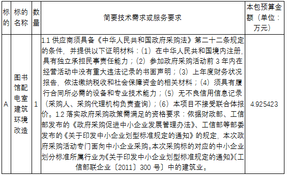 2.落实政府采购政策需满足的资格要求:依据财政部、工信部发布的《政府采购促进中小企业发展管理办法》、工信部等部委发布的《关于印发中小企业划型标准规定的通知》的规定,本次政府采购活动专门面向中小企业采购。本次采购标的对应的中小企业划分标准所属行业为《关于印发中小企业划型标准规定的通知》〔工信部联企业〔2011〕300号〕中的建筑业。