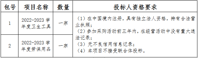 采购内容:2022-2023学年度卫生工具、劳保用品;本项目划分两个包;